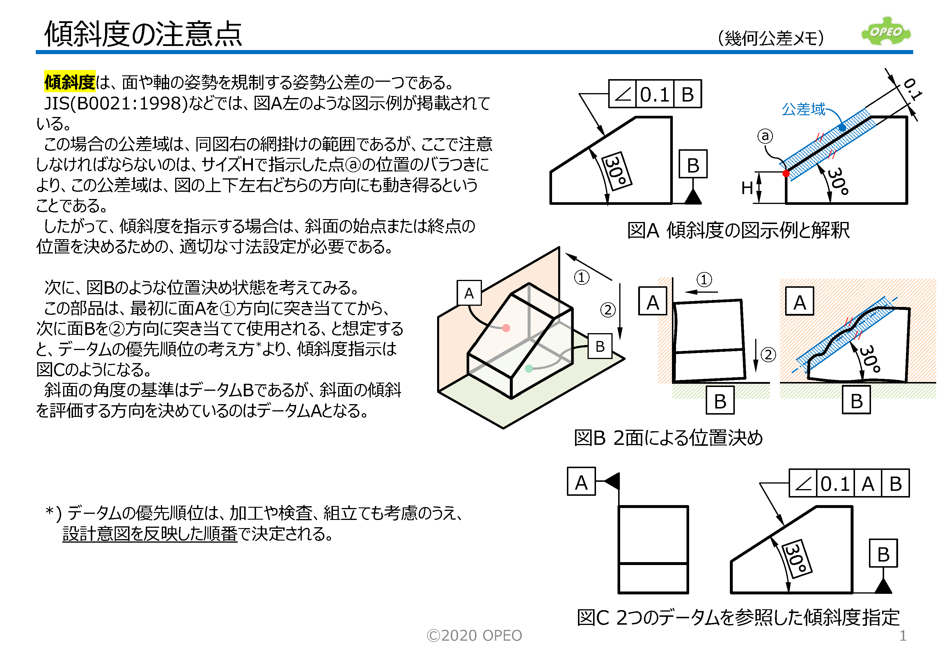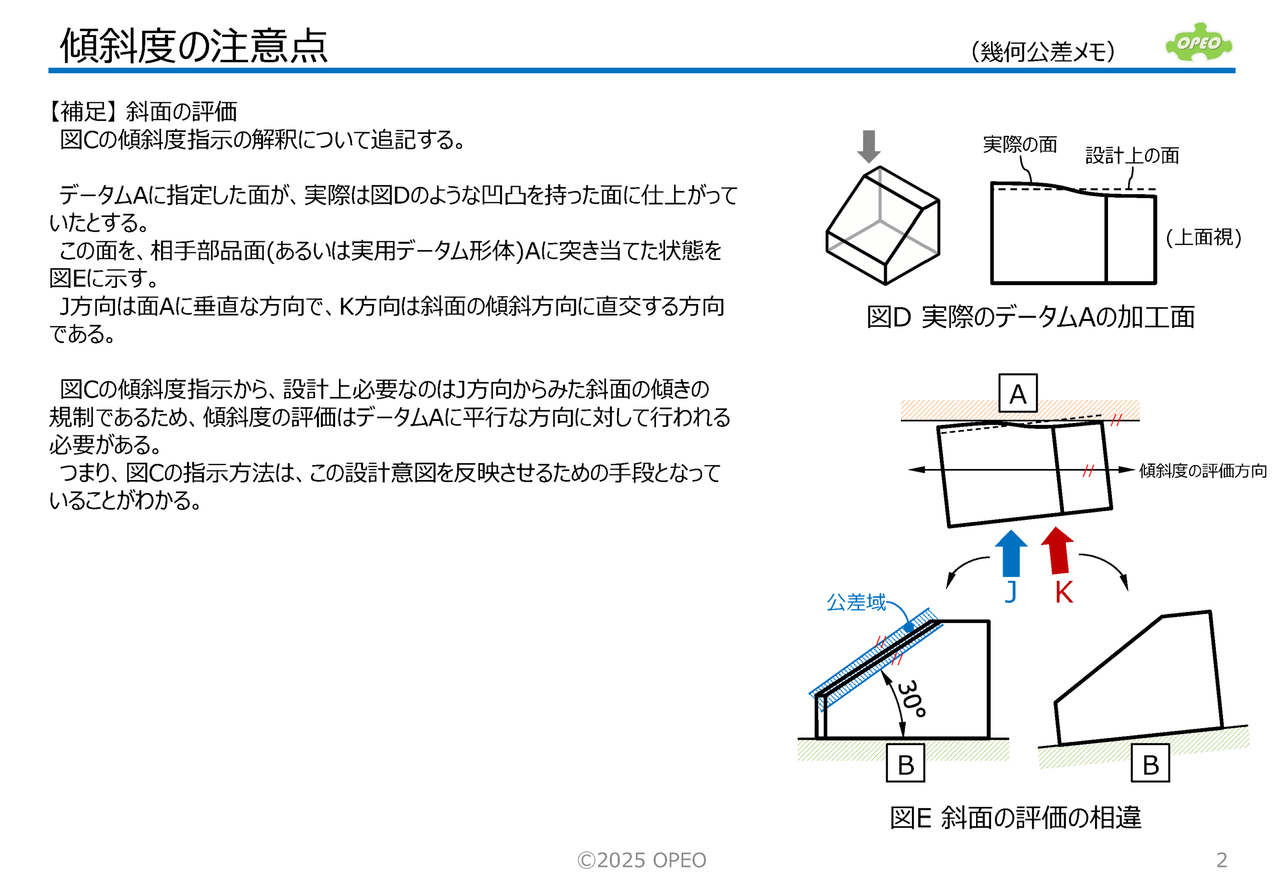 ■傾斜度を使用する上での留意事項に関する解説です。 傾斜度は姿勢公差の一つで、姿勢公差のグループの中では唯一(明示的に)TEDを使用します(厳密には、姿勢公差としての輪郭度も、TEDを使用する場合があります)。 このTEDは角度寸法ですが、公差域は角度ではなく、あくまでも平行2平面の間であることに注意します。