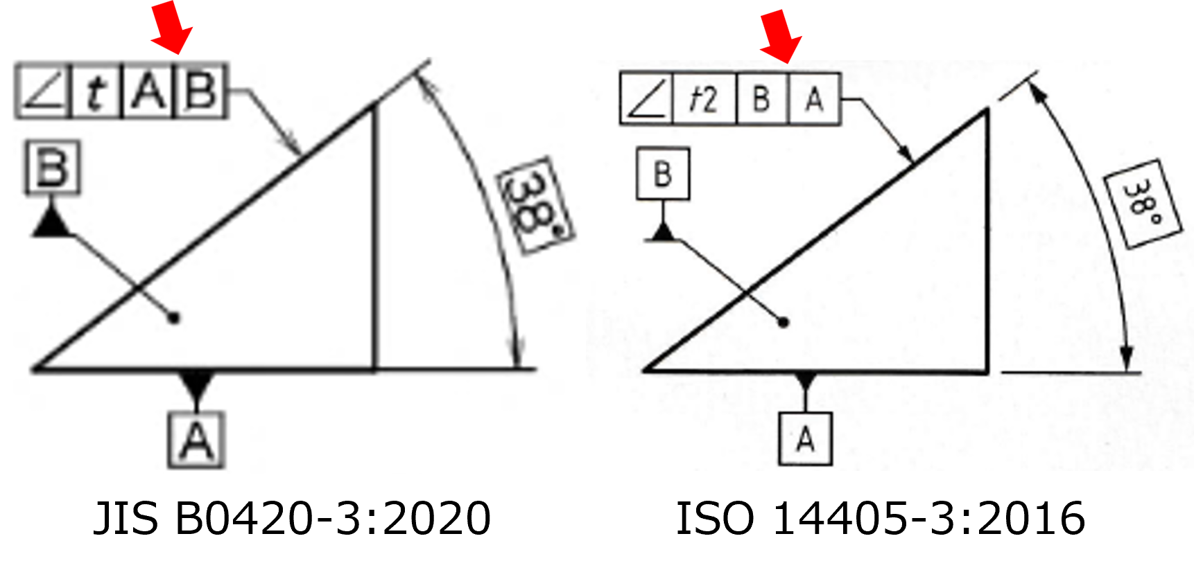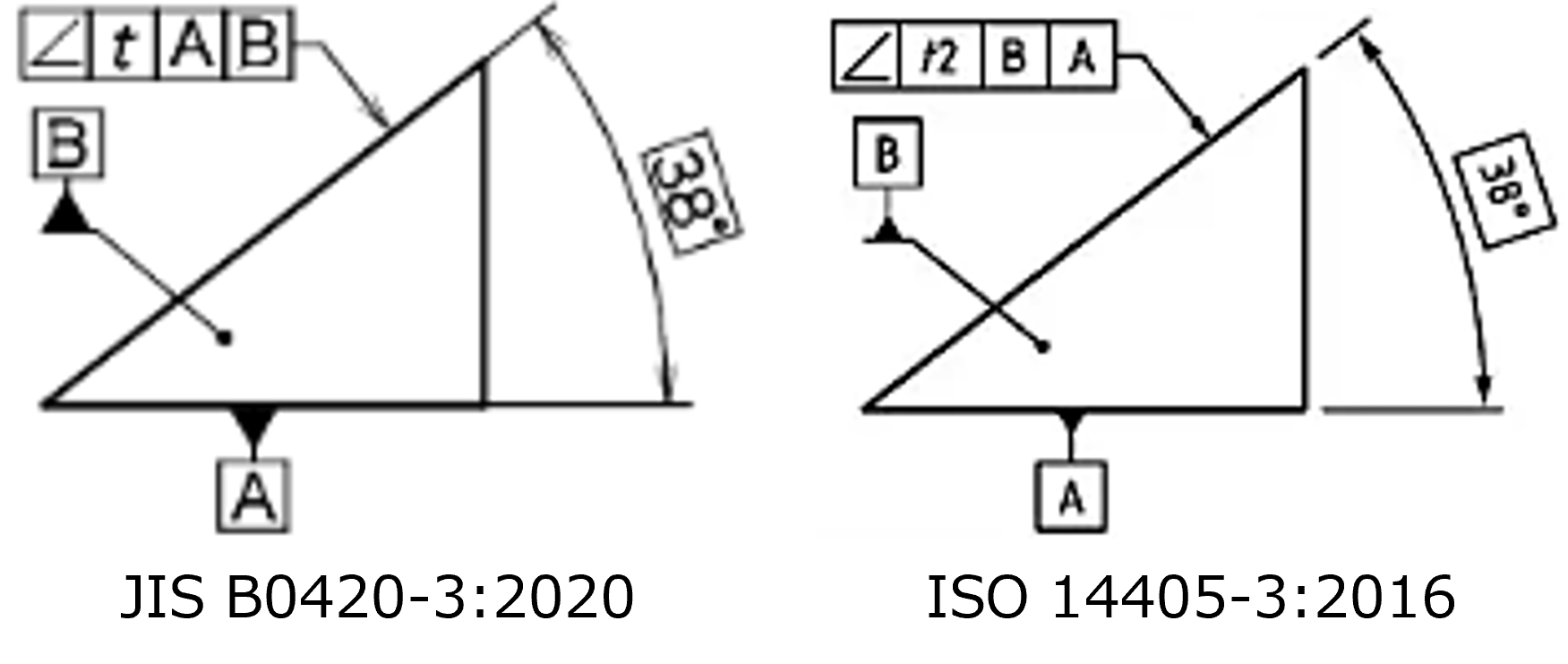 右図は、データムを2つ参照した傾斜度の図例を、JIS(左)とISO(右)で比較したものです。 |