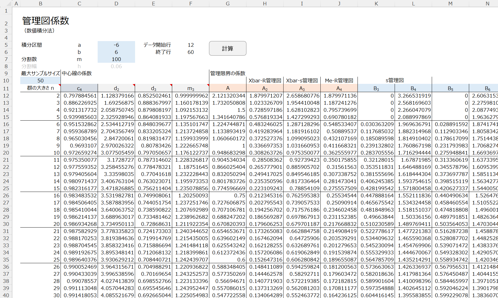 この管理図の意味や使い方などはQC検定のキーポイント集で解説していますが、ここでは管理図係数の中でも、累積分布関数の積分を含んだ算出難易度の高い2つの係数を、Excel VBAを用いて計算する方法について概要を説明します。 なお、ここで紹介した手法を用いたExcel計算シートと、指定した管理図係数の値を返すExcel VBA用のソースコードを掲載しています。