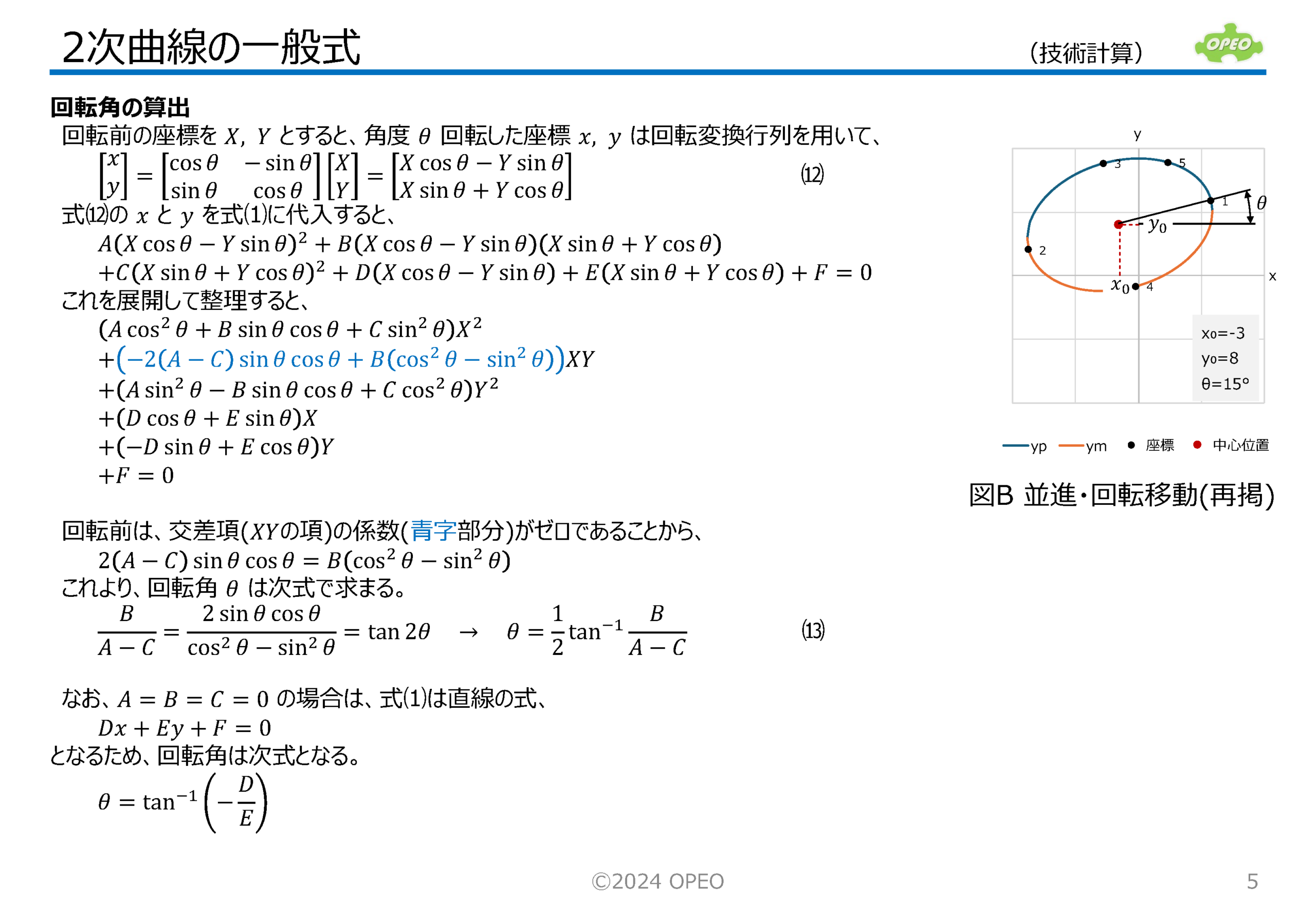 2次曲線の一般式の解説です。 2次曲線には楕円(ellipse)、双曲線(hyperbola)、放物線(parabola)がありますが、この記事では、これらの形を決めるための係数と、位置や傾きおよび接点を求める式の導出手順について説明しています (連立方程式を解く際は、Excelの行列関数を使えば簡単にできます)。 2次曲線の一般式は、 一方、係数が未知で、点の座標から2次曲線を求めるには、係数に関する方程式を立てる必要があります。 さて、右図上は一般形の楕円の例ですが、これを原点を中心とした標準形にするためには、 なお、2次曲線の一般式において、 |