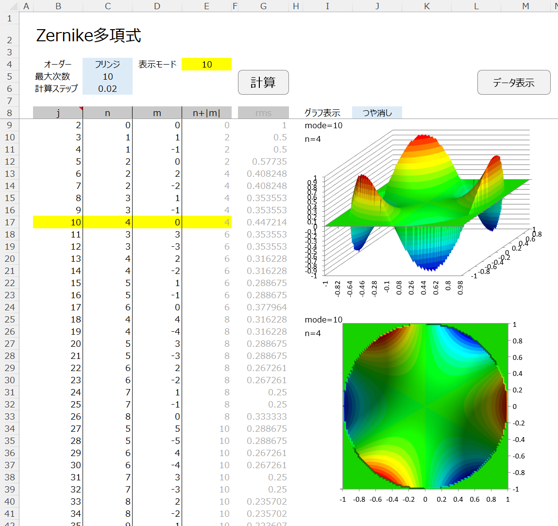 本記事の計算式を用いて、Zernike多項式近似曲面を計算するExcelシートです。