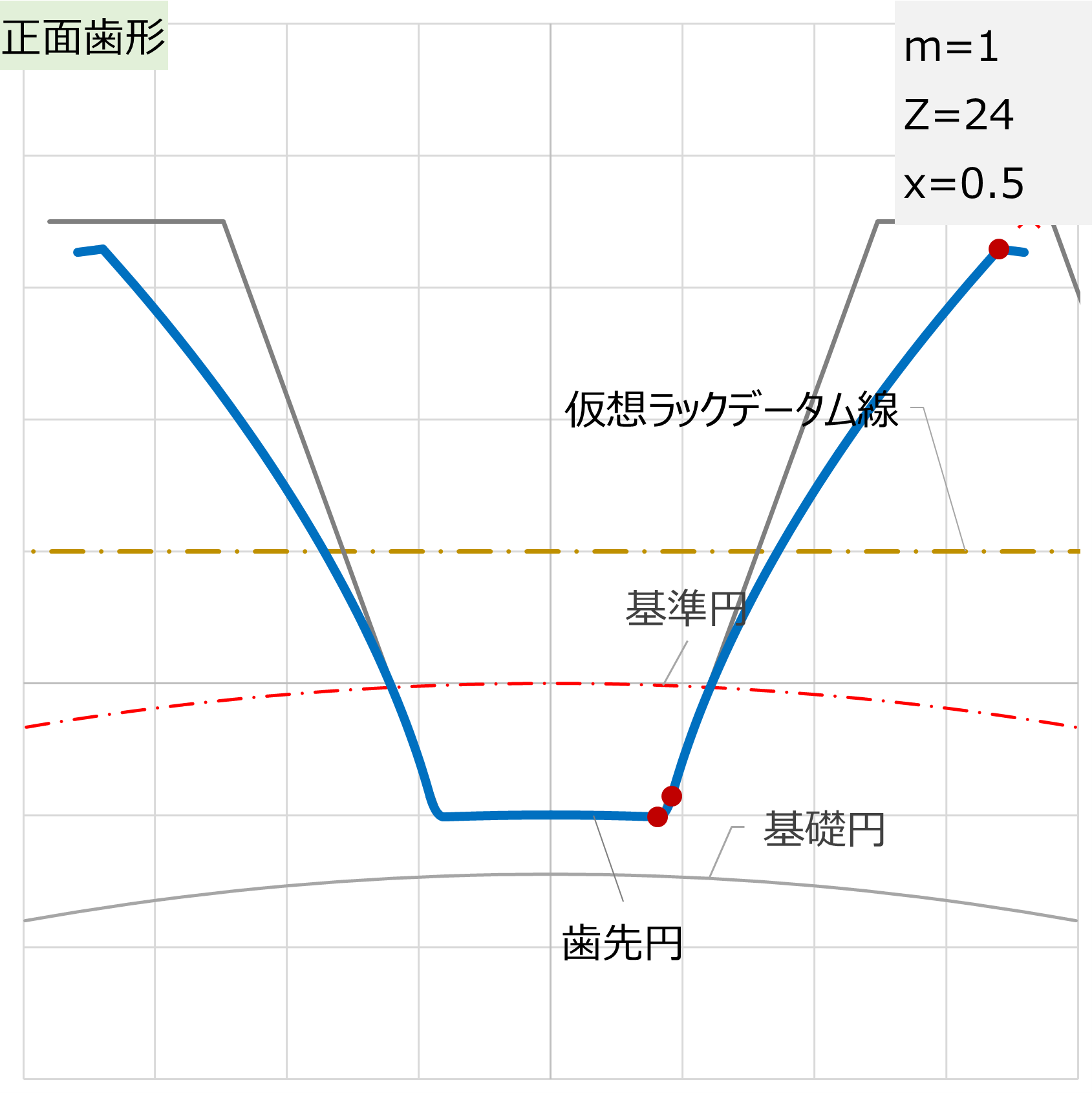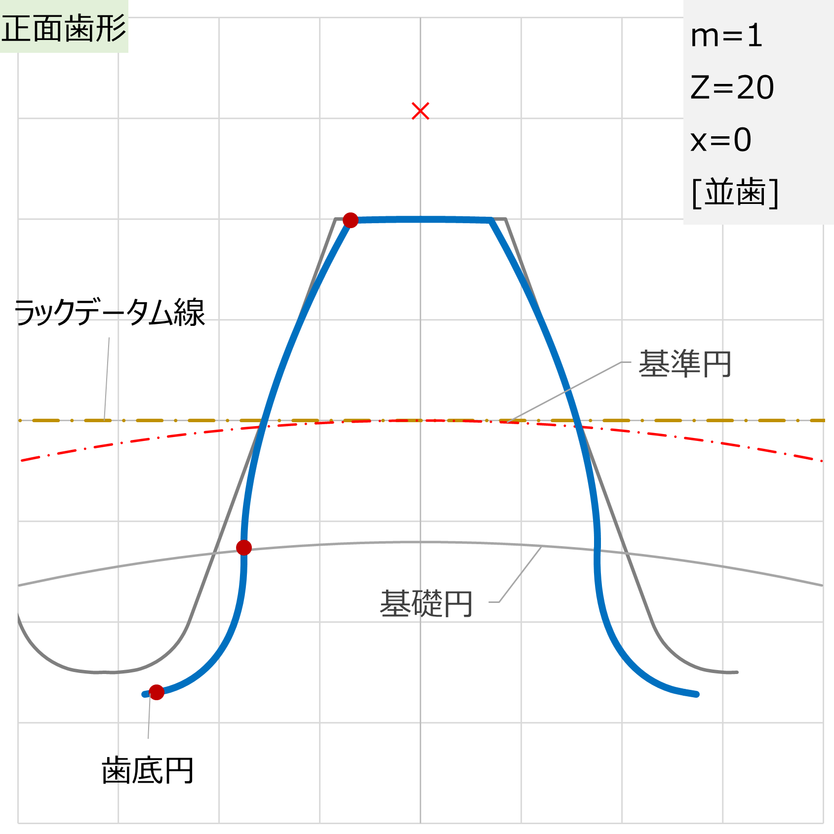 歯車の歯形は、基礎円から歯末(歯先)方向はよく知られたインボリュート曲線ですが、歯元方向はトロコイド(エピトロコイド)曲線になります。 |