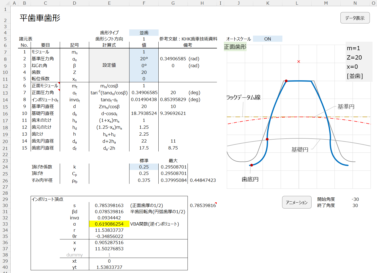 インボリュート平歯車と内歯車の、創成歯形の形状サンプルを表示するExcelファイルです。