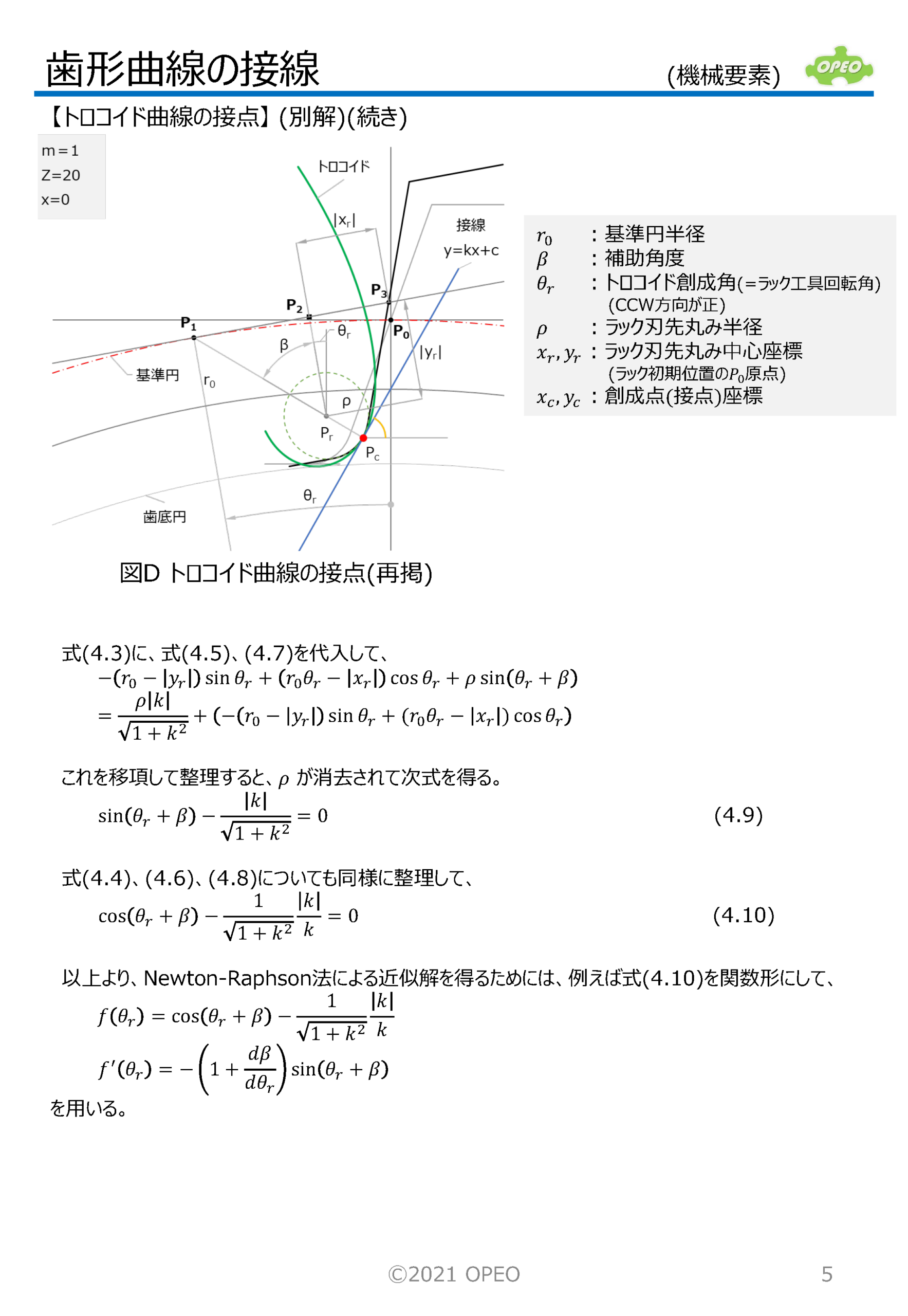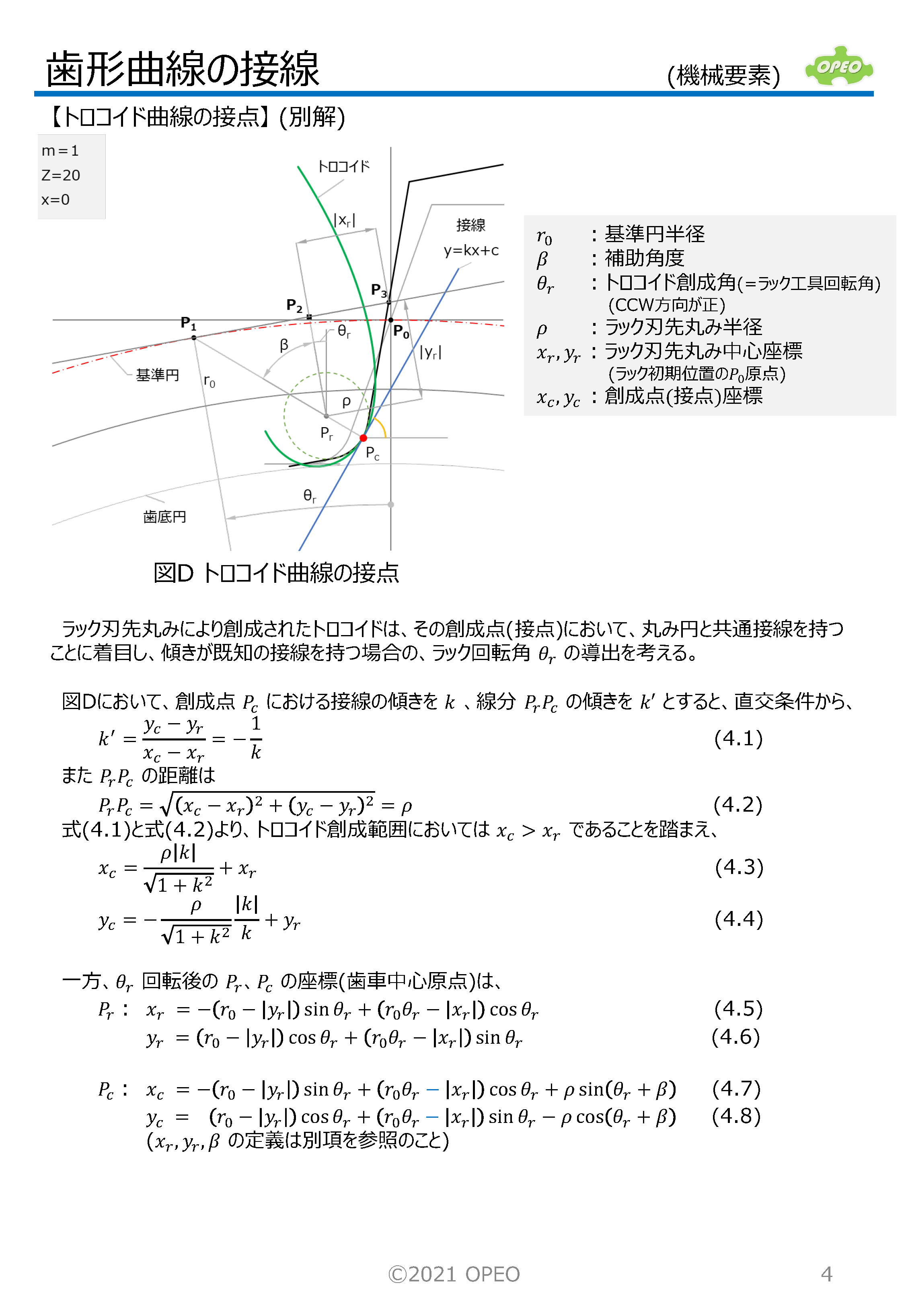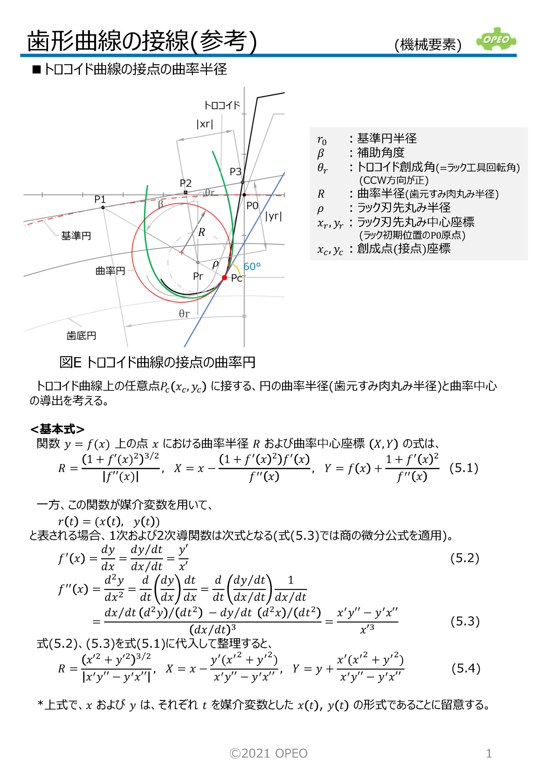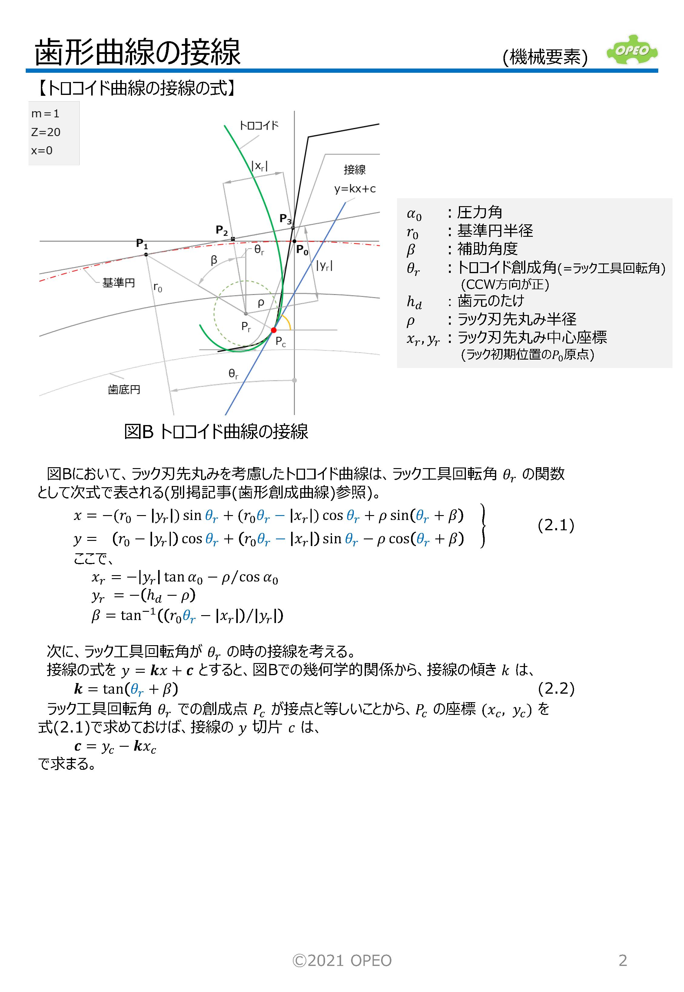インボリュート歯形の曲線の接線の式や、接点座標を求める方法です。 トロコイド曲線の場合の、指定した傾きの直線との接点座標は、歯形係数計算時の歯元危険断面位置を算出する場合に必要となります。 また参考として、トロコイド曲線上の接点における曲率半径の算出式、インボリュートとトロコイドが共通接線を持つ場合のラック工具回転角の算出式も掲載しています。 なお、JIS B1759では、本稿記載の関数解ではなく、幾何学的関係から導出された式が掲載されています。 |