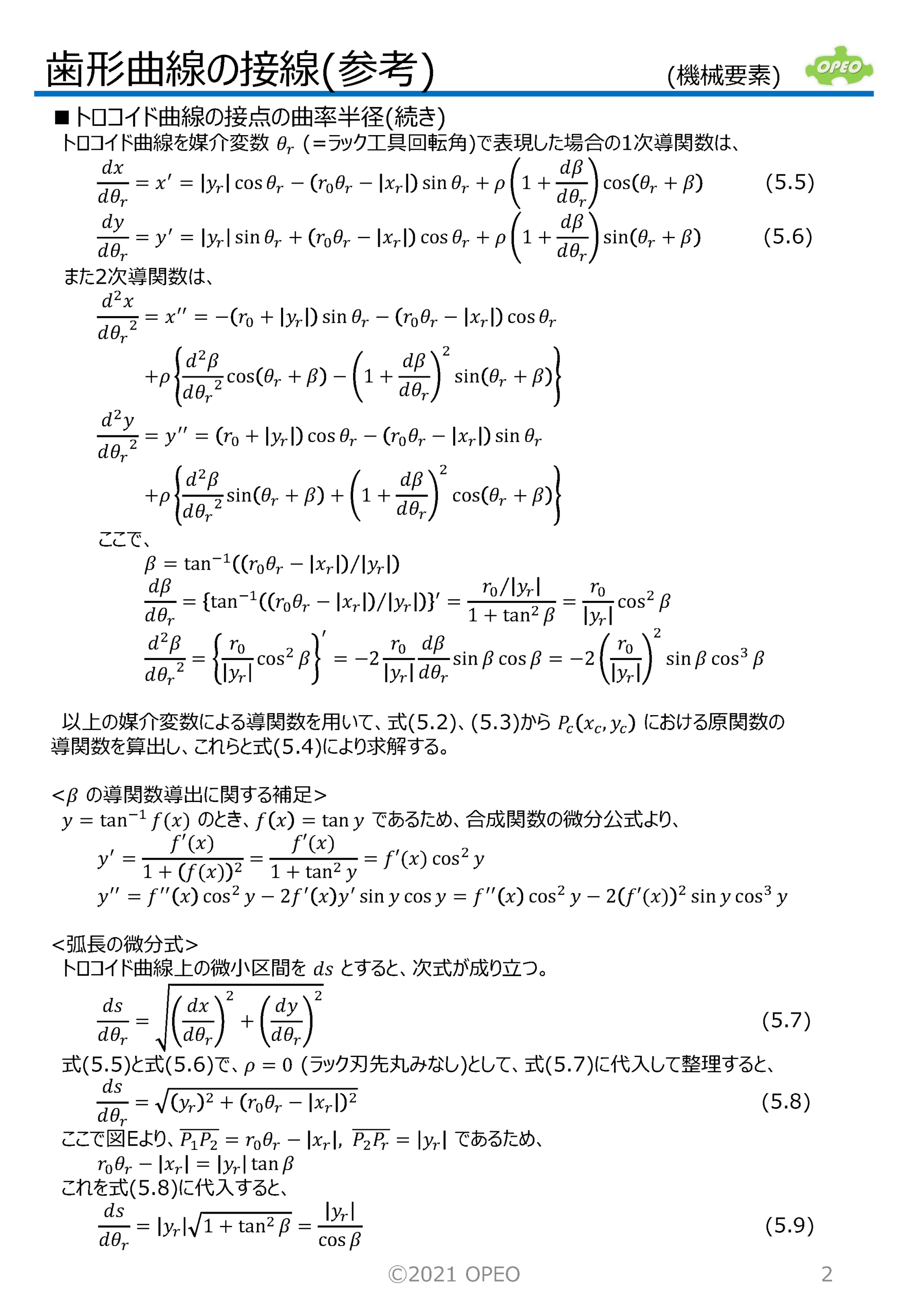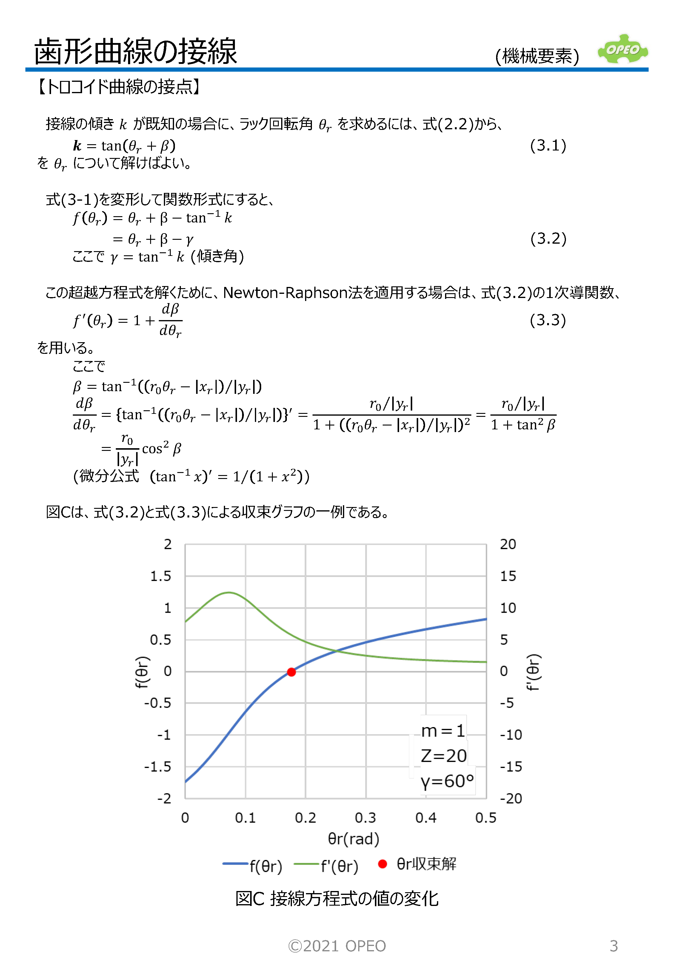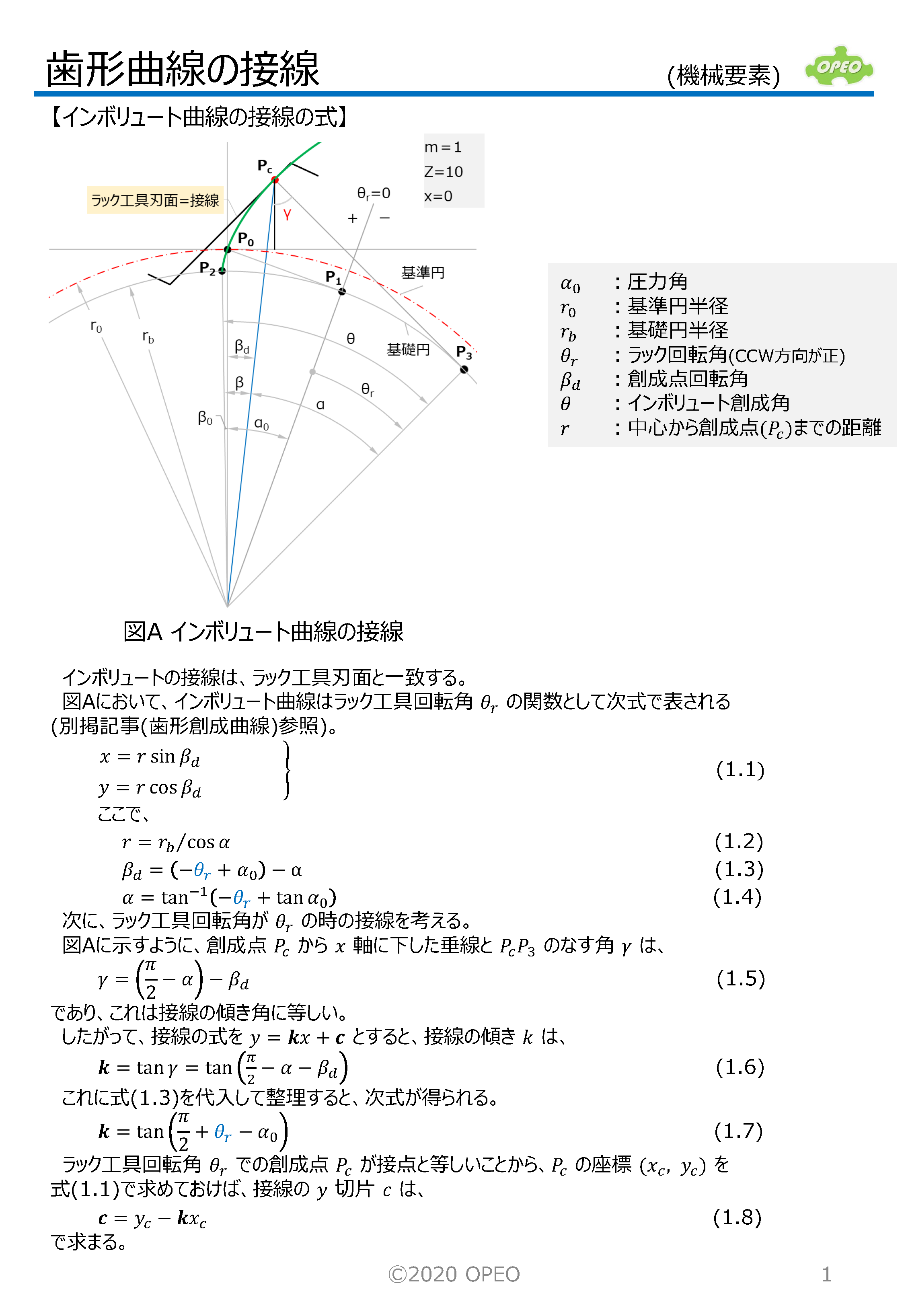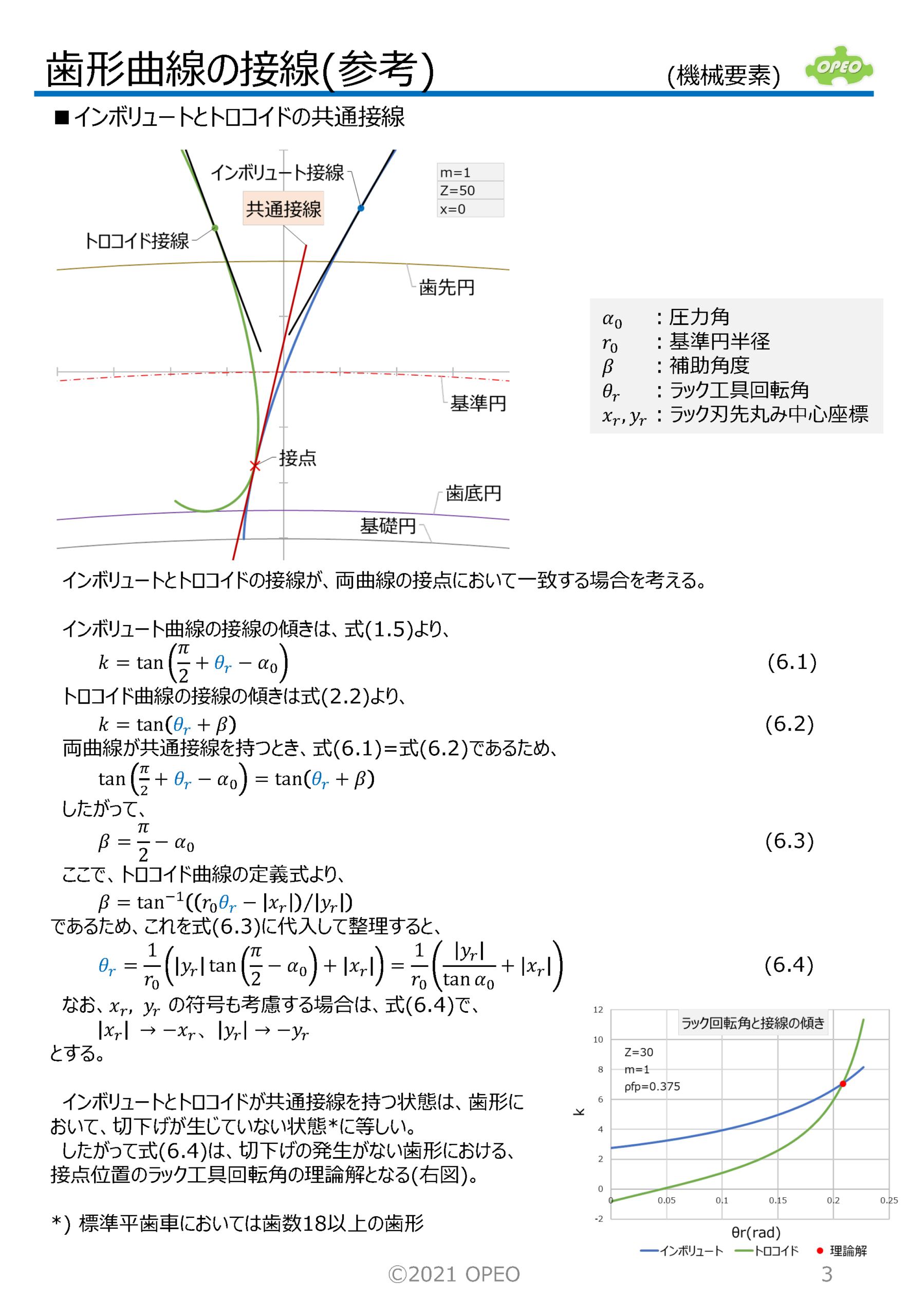 インボリュート歯形の曲線の接線の式や、接点座標を求める方法です。 トロコイド曲線の場合の、指定した傾きの直線との接点座標は、歯形係数計算時の歯元危険断面位置を算出する場合に必要となります。 また参考として、トロコイド曲線上の接点における曲率半径の算出式、インボリュートとトロコイドが共通接線を持つ場合のラック工具回転角の算出式も掲載しています。 なお、JIS B1759では、本稿記載の関数解ではなく、幾何学的関係から導出された式が掲載されています。 |