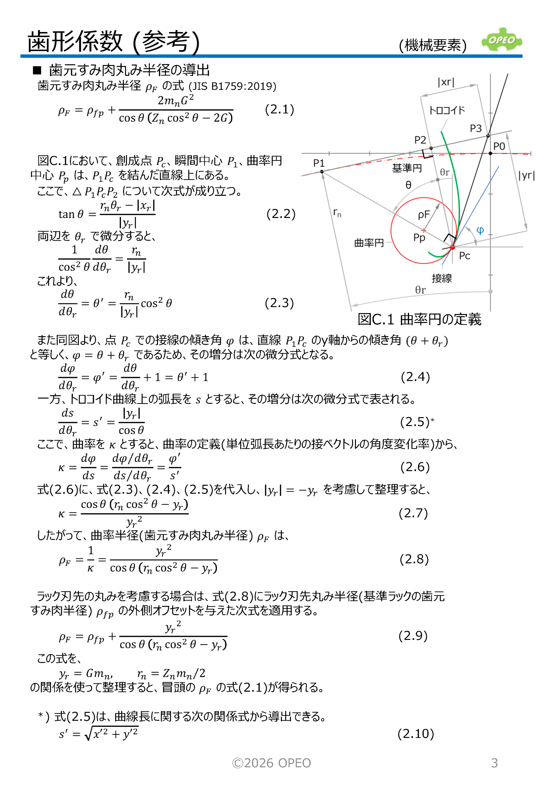 歯車の強度計算では、前もって歯形係数を求めておく必要があります。 なおJISの式では、記事中の θ を求めるために補助変数を定義して計算していますが、30°接線位置までのラック工具回転角 θr が求まれば、これらの変数を用いる必要はありません(JIS式は、ラック工具刃先が歯底円と接している状態から、30°接線との接点位置まで回転する角度を計算しています)。 この θr は、別掲記事(歯形曲線の接線)内の計算方法により求めることが可能です(θr が求まれば接点座標も求まります)。 記事の最後に、歯元すみ肉丸み半径 ρF (右下図)の式の、導出手順を紹介しています。