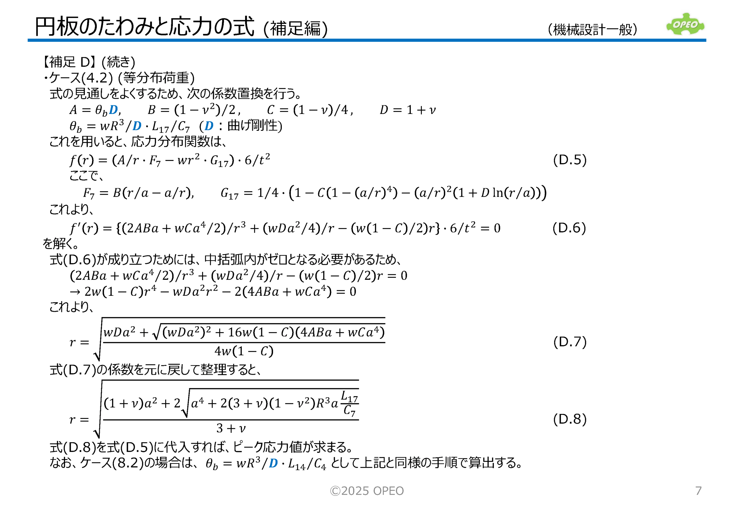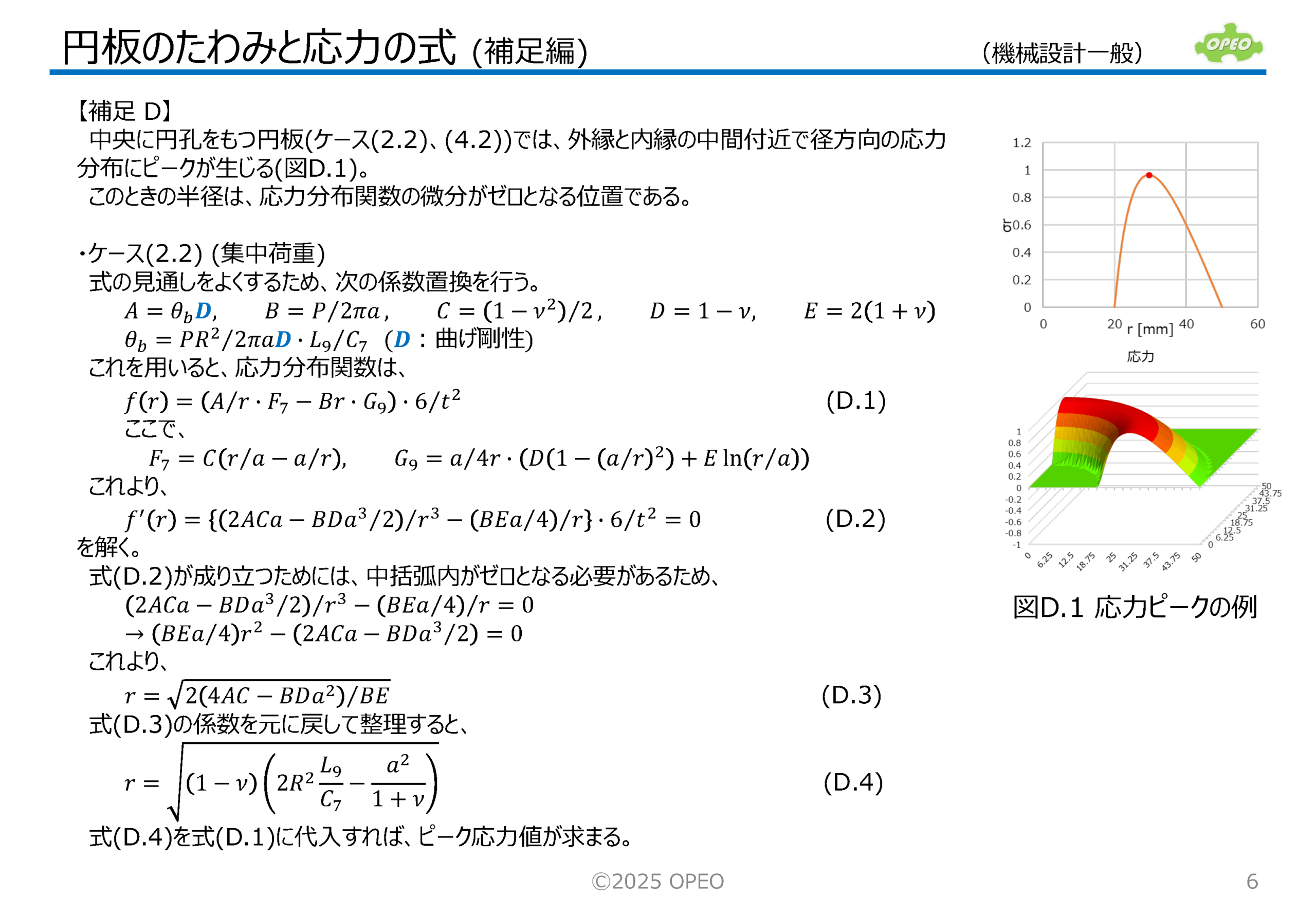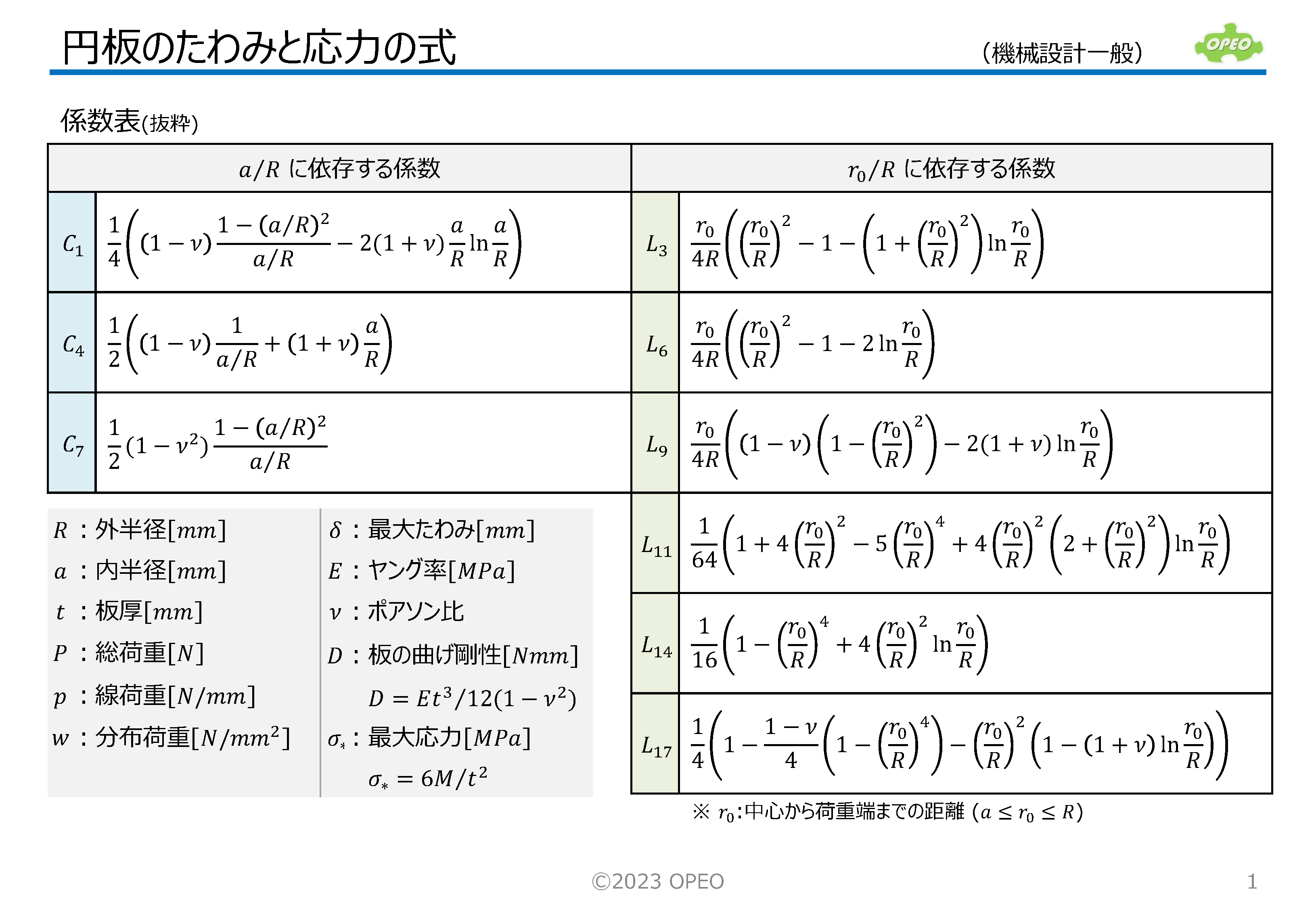 集中荷重や等分布荷重を受ける、円板のたわみと応力を求める式を集めた資料です。 円板のたわみと応力の計算式はいろいろなサイトで公開されていますが、記事によって式や結果が異なっているケースもあり、どれが正解かわかりにくいという状況もあります。 この記事では、参考文献に掲載されている式を参照して、できるだけ分かり易い形式になるよう式変形した形でまとめています。 ※補足 |