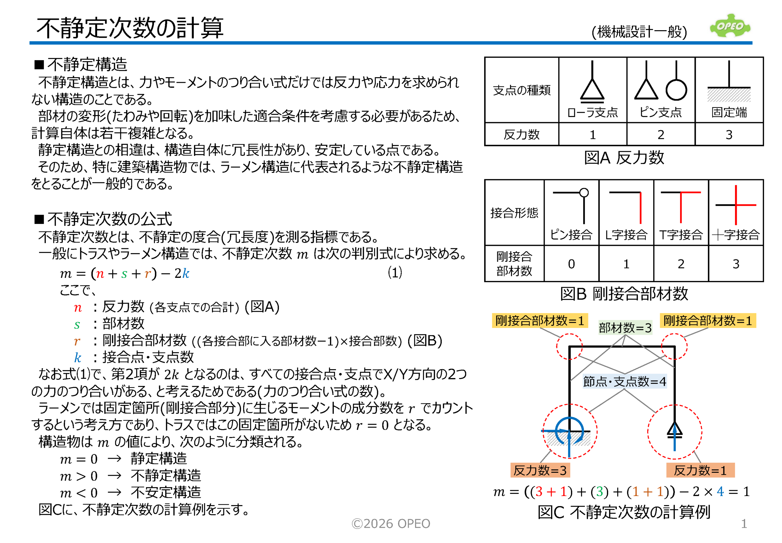 不静定構造の不静定次数を算出する、統合公式についての解説です。 不静定構造とは、力やモーメントのつり合い式だけでは反力や応力を求められない構造のことで、静定構造との違いは、構造自体に冗長性があり安定している点です。 不静定次数の計算では、一般に、構造がはりかトラスかラーメンかで公式が異なります*が、これらをひとつの統合公式として扱うことができれば、便利です。 ここでは、その統合公式と、統合化のために留意すべき点を解説しています。 *) 公式の違い (記号 n, s, r, k の意味については本文参照) |