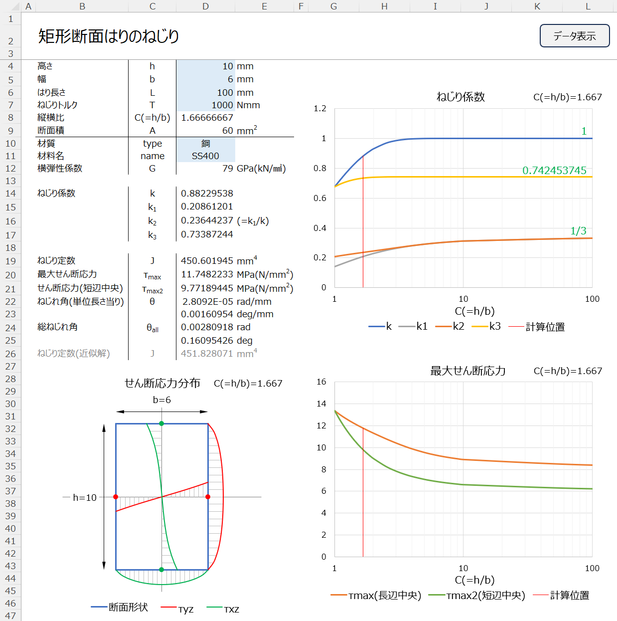 このExcelでは、矩形断面はりのねじり係数、ねじり定数および最大せん断応力の計算を行います。
